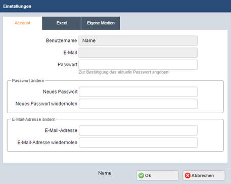 Auf dem Reiter Account kann sowohl das automatisch zugewiesene Passwort als auch die E-Mail-Adresse geändert werden.