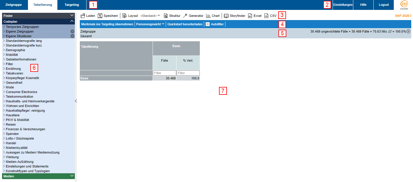 | 1 | Reiter Es stehen Ihnen drei Module zur Verfügung, die über den jeweiligen Reiter aufgerufen werden können. Die Funktionen des Moduls werden ausführlich im jeweiligen Abschnitt erklärt. Siehe Zielgruppe, Tabellierung, Targeting. |
