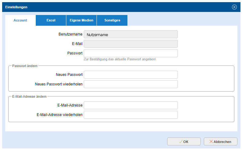 Im Ordner Account kann sowohl das automatisch zugewiesene Passwort als auch die E-Mail-Adresse geändert werden.