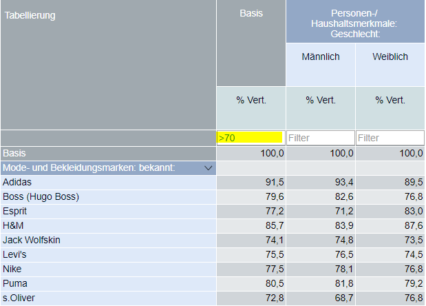 Über die Eingabe einer Bedingung im Feld Filter unterhalb des Leistungswertes wird die Tabelle gemäß der Vorgabe reduziert.