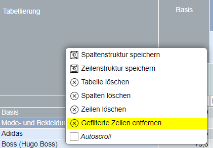 Über das Kontextmenü können die gefilterten Zeilen aus der Auswertung gelöscht werden.