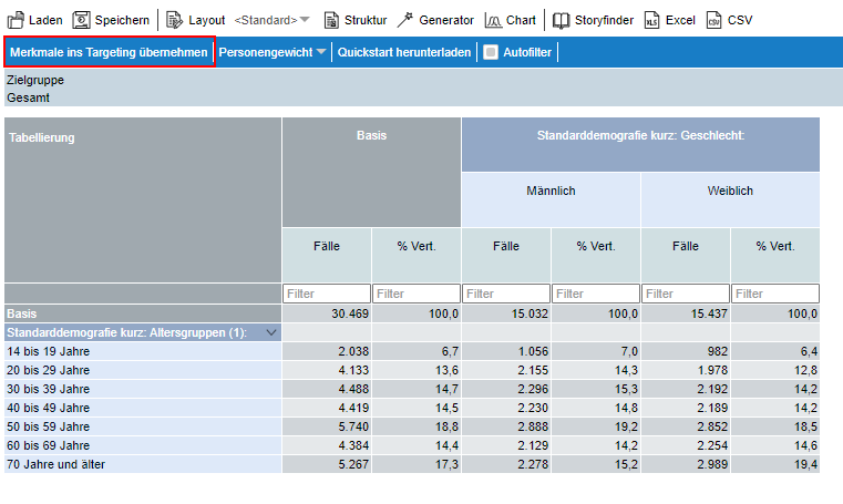 Mit Klick auf diese Auswahl werden alle Elemente der Vorspalte und des Tabellenkopfes in das Modul Targeting übernommen.