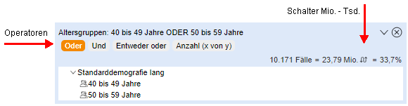 Sobald zwei oder mehr Zielgruppen verknüpft werden, sind die Verknüpfungs-Operatoren direkt aus einer horizontalen Liste wählbar. Der verwendete Operator ist farblich hervorgehoben.