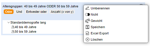 Alle Bearbeitungsoptionen wie Speichern und Löschen einer Zielgruppe sind über das Menü der rechten Maustaste auf der Titelzeile wählbar.