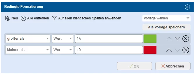 Formatiere individuell und beliebige Leistungswerte in den (gleichen) Spalten und speichere diese als Vorlage (s. Formatierungen)