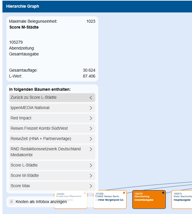 Die Belegungsmöglichkeiten im Tageszeitungsgeschäft sind im Hinblick auf Unterausgaben und Regionalausgaben teils sehr komplex. Der Hierarchie-Graph bricht die Strukturen von Haupt- und Unterausgaben in der ma Tageszeitungen auf und erleichtert somit den Umgang von Streuungsanalysen.