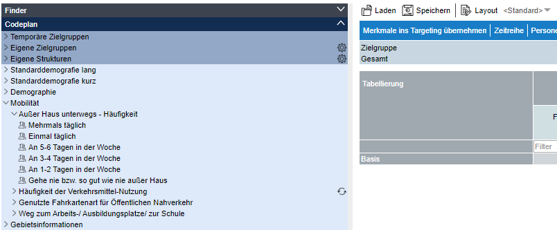 Die Zielgruppenauswahl im Codeplan ist hierarchisch strukturiert: Die oberste Ebene liefert eine Grobeinteilung der zur Verfügung stehenden Informationen. In der Regel wird die zweite Ebene aus den erhobenen Merkmalen (=Fragen) der Studie gebildet. Die letzte Ebene enthält die Ausprägungen der Fragen und wird durch das Icon gekennzeichnet.