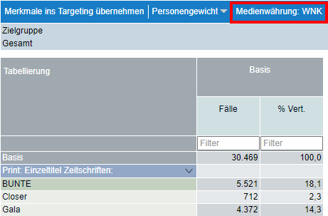 Mediendaten stehen in der Kurzzeit-Version von M-Cloud auf Basis Weitester Nutzerkreis (WNK) für Auswertungen zur Verfügung. Dokumentiert wird die Medienwährung in der Zeile oberhalb der Tabelle.