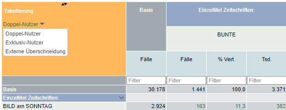 Standardmäßig werden bei Zählungen Medien gegen Medien die Doppelnutzer ausgewiesen. Wechsel Sie direkt in der Tabellierung zu Ihrer gewünschten Nutzergruppe.