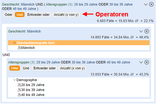UND wirkt immer einschränkend, d. h. die Zielgruppengröße ist KLEINER oder gleich der Einzel-Zielgruppen.