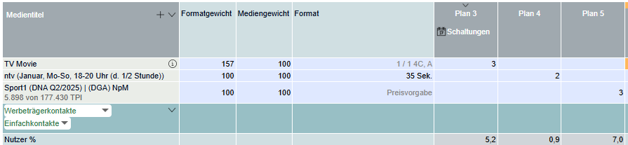 Der Aufbau ist variabel, d.h. die Reihenfolge kann nach Vergabe der fest gesetzten Spalten für die Plannamen mit den weitere Spalten Spotlänge und PIs vertauscht werden (s. Streupläne importieren)
