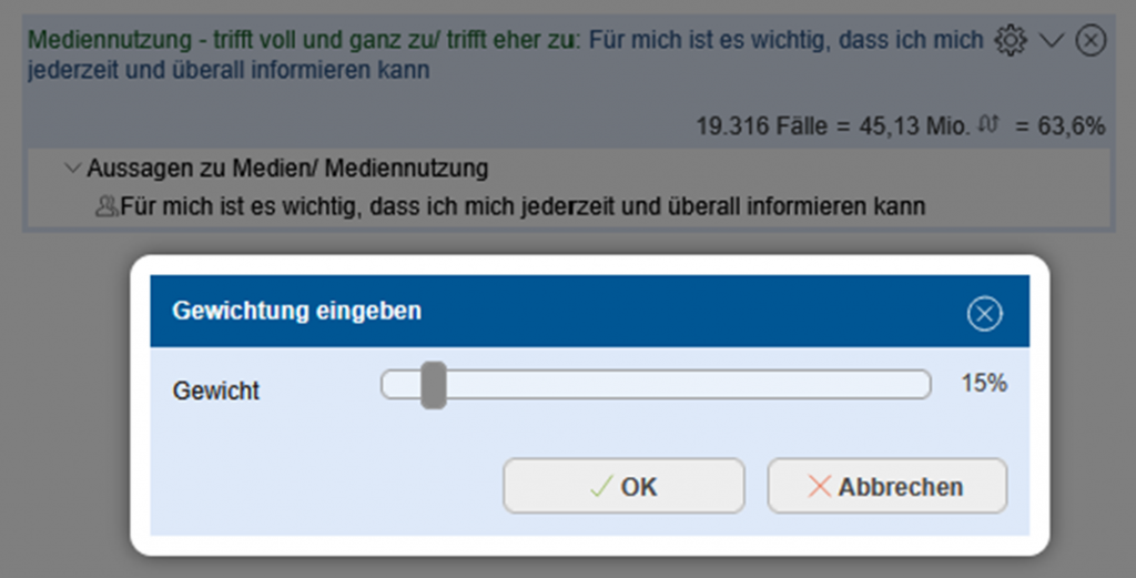 Dankbar bin ich aber für diese Gewichtungsoption, wenn es um spitze Zielgruppen geht. Oft haben diese Zielgruppendefinitionen eine zu geringe Fallzahl, die mit weiteren Definitionsvariablen für ein größeres Zielgruppenpotenzial zu ergänzen sind. Diese Merkmale passen aber meistens weniger gut und wenn sie dazu noch fallzahlmächtig sind, besteht die Gefahr, die Zielgruppe zu verwässern. Und hier kommt die Gewichtung ins Spiel: Dieses Merkmal kann so herunter gewichtet werden, dass selbst gesetzte Fallzahlgrenzen überschritten, aber die Zielgruppe nicht übermäßig verwässert wird.