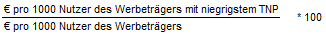 | Index TNP | Basis der Indexberechnung ist der Werbeträger mit dem niedrigsten Tausend-Nutzer-Preis. Der beste Werbeträger erhält den Indexwert 100, je höher der TNP, desto geringer der Indexwert. Der Index wird als Quotient berechnet: ![]() | RR | |