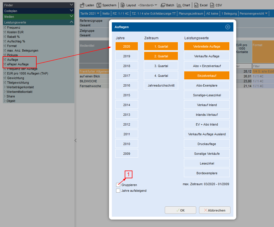 Für Zeitungen können die IVW-Quartalsauflagen nach Erscheinungsweise ausgewählt werden.