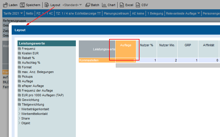 Die im Auflagen-Dialog vorgenommen Einstellungen werden bei der Auswahl eines Layout-Profils im Leistungswert Auflage übernommen. Der Leistungswert Auflage stellt im Profil somit einen Platzhalter dar.