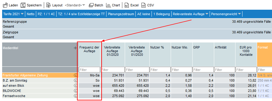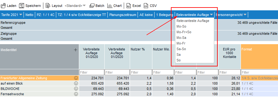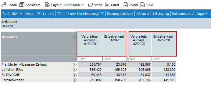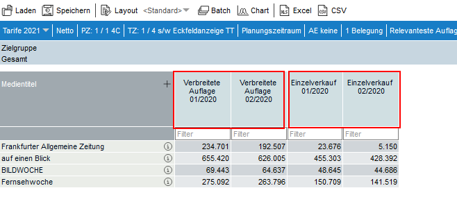 Ist die Option Relevanteste Auflage aktiviert, so werden die Auflagenzahlen für den größten erhobenen Zeitraum je Titel ausgewiesen.