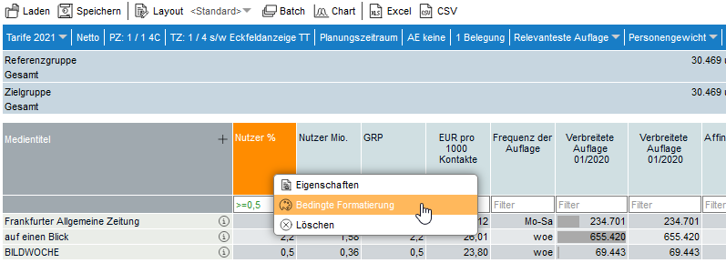 Die Rangreihe kann analog zur Tabellierung individuell angepasst werden. Medien können sortiert, Wertebereiche gefiltert und bedingte Formatierungen eingerichtet werden. Spezifisch für die Rangreihe ist die Darstellung von Histogrammen.