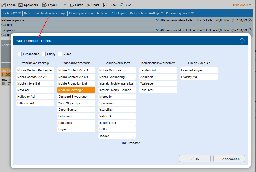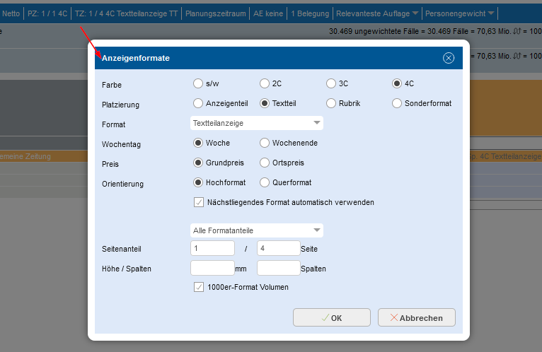 Über den Leistungswert Format (1) kann eine von Grundformen abweichende Werbeform ausgewählt werden.
