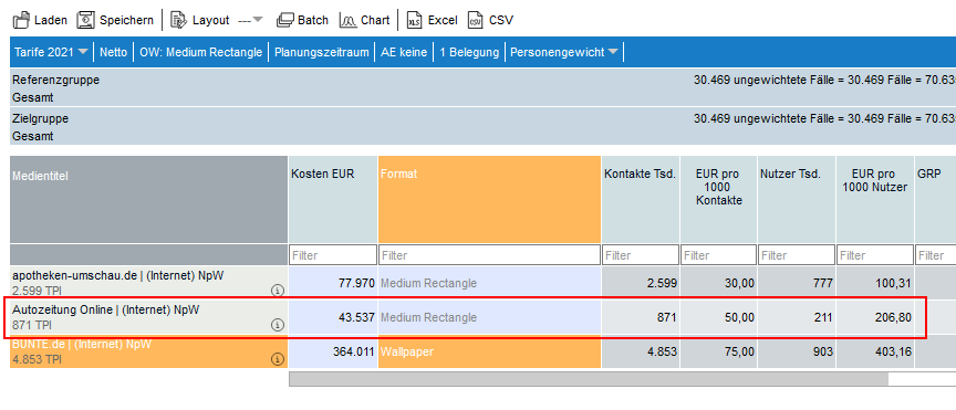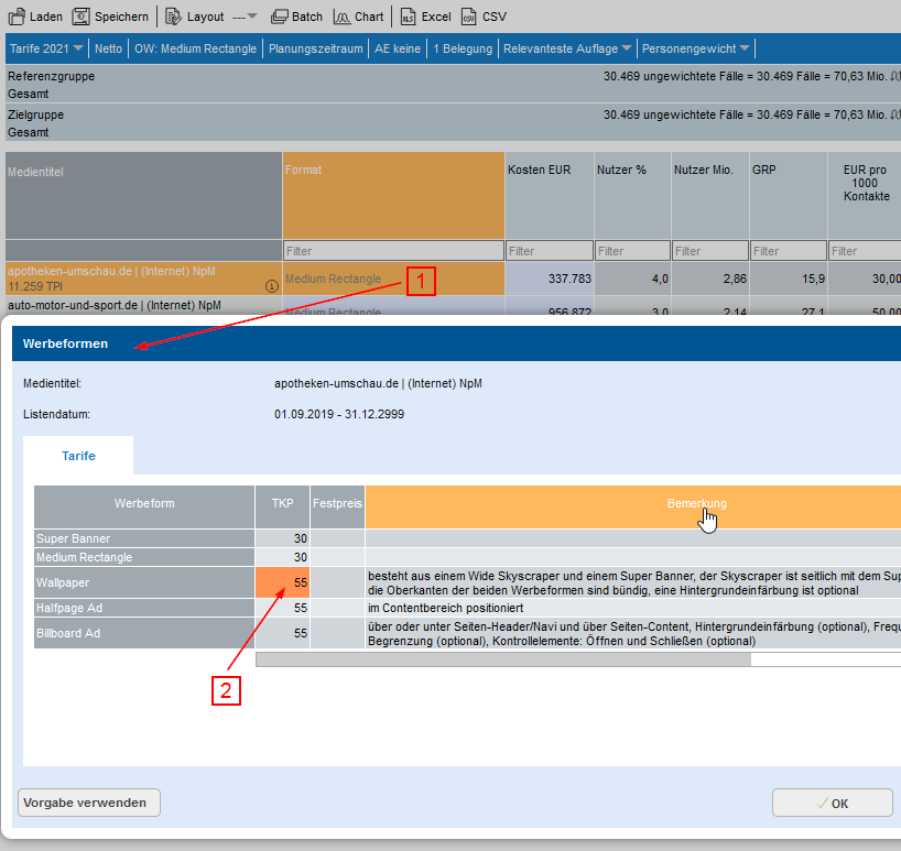 Mit Klick auf den Preis in der Spalte TKP (2) wird das Format mit dem Preis in die Auswertung übernommen. Ist kein Tarif hinterlegt, besteht noch die Möglichkeit, in der Spalte Kosten einen Preis vorzugeben.