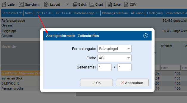 Für Zeitschriften wird als Grundformat 1/1 Seite 4c verwendet.