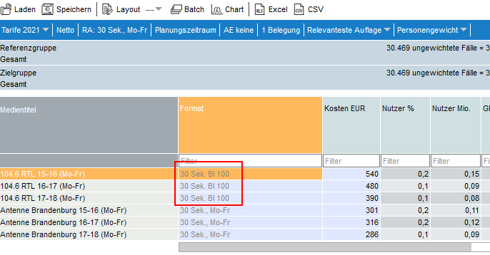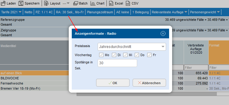 Auf Sender mit Jahresdurchschnittpreisen hat die Auswahl der Monate keine Auswirkungen. Für diese und für Zeitschnitte am Sa und So kann in dieser Maske nur die Spotlänge geändert werden.
