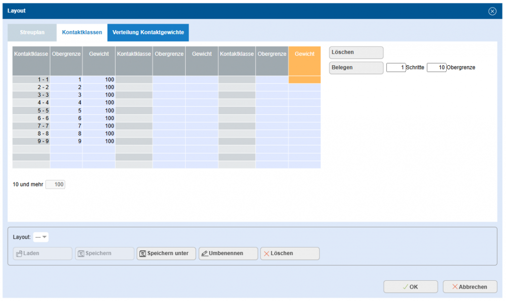 Über den Button Belegen können Sie Schrittweite und Obergrenze vorgeben. Die Obergrenzen können auch direkt in der Maske eingegeben oder gelöscht werden. Die Kontaktklassen werden automatisch an die geänderten Obergrenzen angepasst.