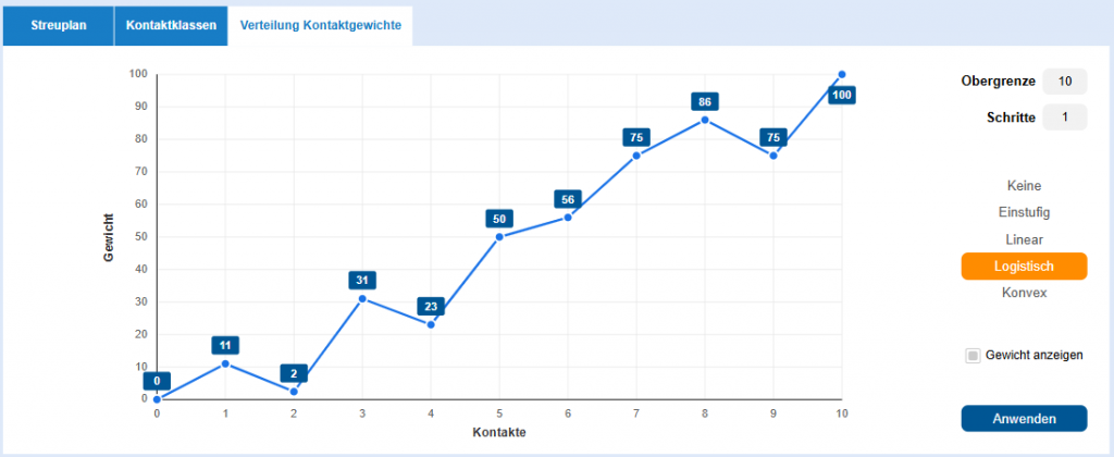 Mithilfe des Mauscursors lassen sich die Gewichte der jeweiligen Kontaktanzahl beliebig nach oben oder unten auf der Y-Achse (Gewicht) verschieben.