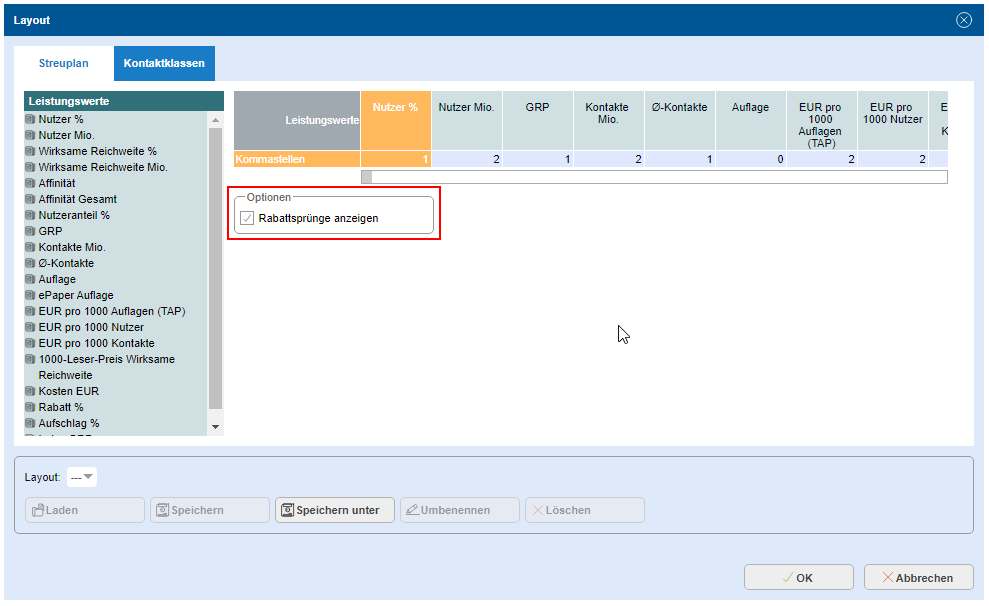 In der Layout-Maske des Streuplans kann die Anzeige über die Option Rabattsprünge anzeigen deaktiviert werden.