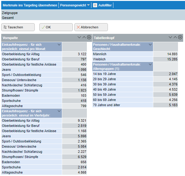 Eine zuvor angelegte Tabelle kann in Struktur bearbeitet werden. Einzelne Merkmale oder Zeilen können per Drag & Drop an eine beliebige Position in der Tabelle verschoben werden: aus der Vorspalte in den Tabellenkopf oder einzelne Statements innerhalb eines Merkmals.