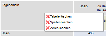 Über das Menü der rechten Maustaste im Tabellenfeld „Tagesablauf“ kann die gesamte Tabelle, der Tabellenkopf oder die Vorspalte der Tabelle komplett gelöscht werden.
