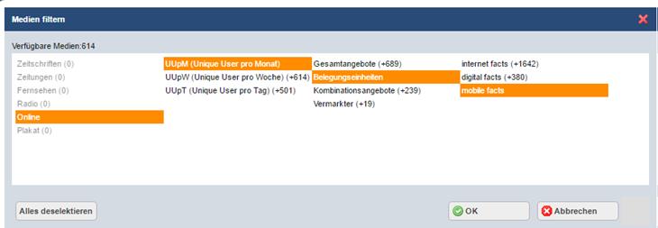 In diesem Beispiel werden nur noch die Unique User pro Monat der Belegungseinheiten mobile facts angeboten. Die Anzahl der gefilterten Medien wird in der Zeile „Verfügbare Medien“ dokumentiert.