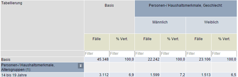 Merkmale werden bei dieser Darstellung auf zwei Ebenen beschrieben – die Merkmalsüberschrift wird in der oberen Zeile ausgewiesen, die Merkmalsausprägungen in der zweiten Zeile des Tabellenkopfes. Die im Layout festgelegte Anzahl Überschriften wird berücksichtigt.
