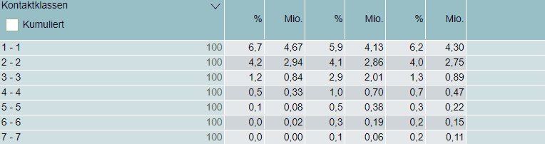 Die Definition der Kontaktklassen kann bei Bedarf individuell angepasst werden. Die Kontaktverteilung wird im Ergebnisbereich des Streuplans angezeigt, eine kumlierte Darstellung ist möglich.